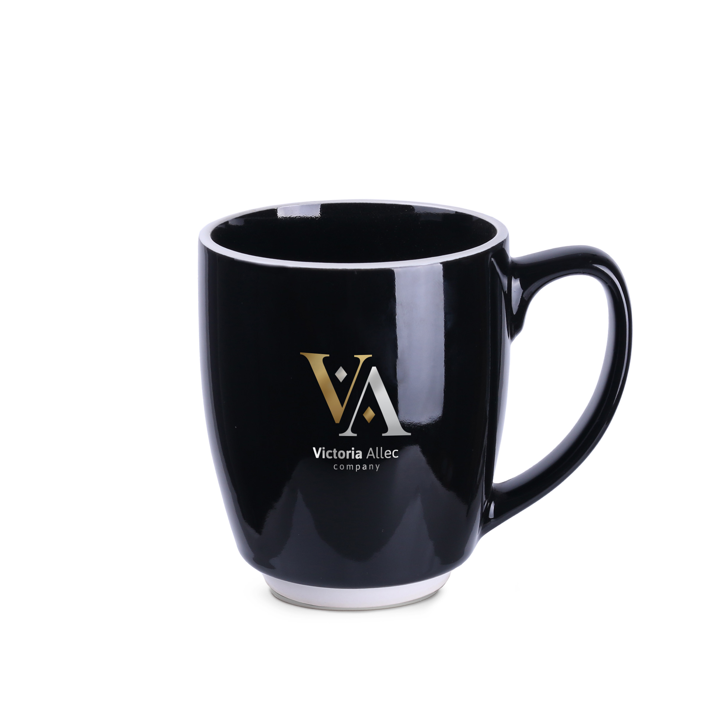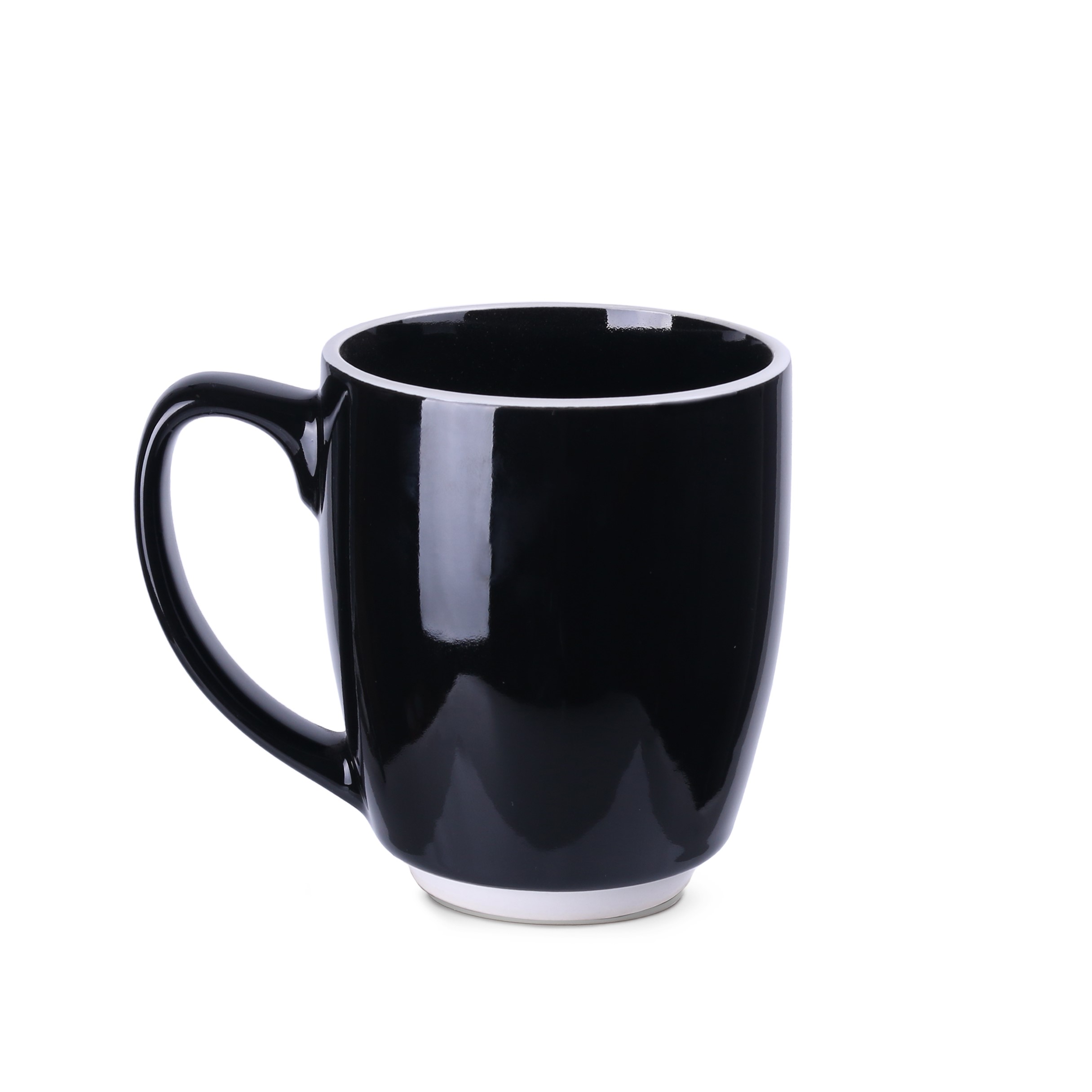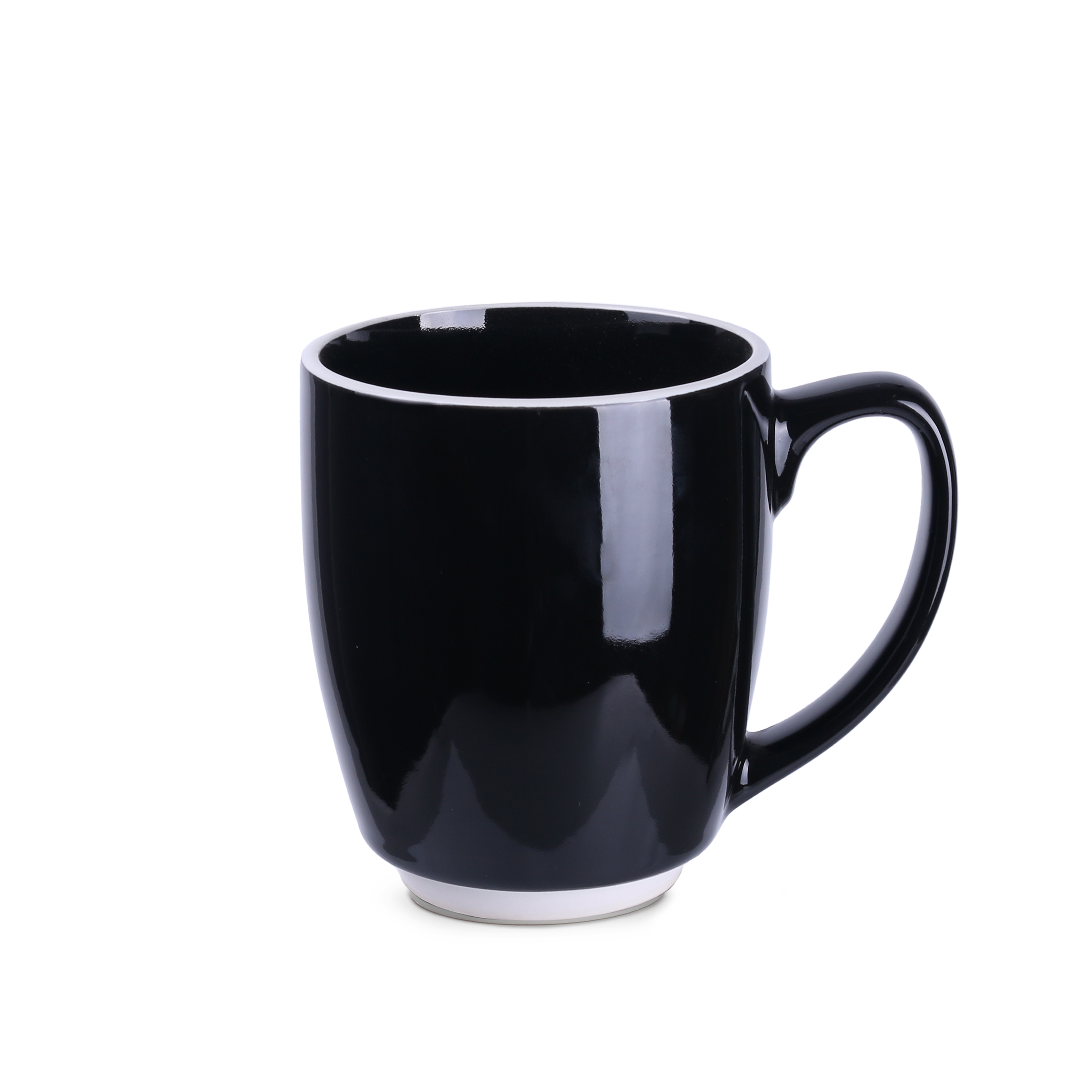 Pojemny, czarny kubek reklamowy o obłym kształcie z charakterystycznymi białymi wstawkami na rancie oraz w dolnej części. Duży uchwyt zapewnia wygodne trzymanie.