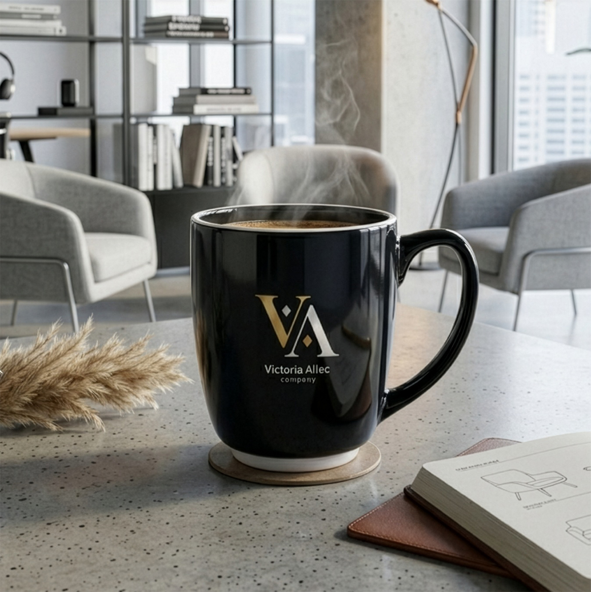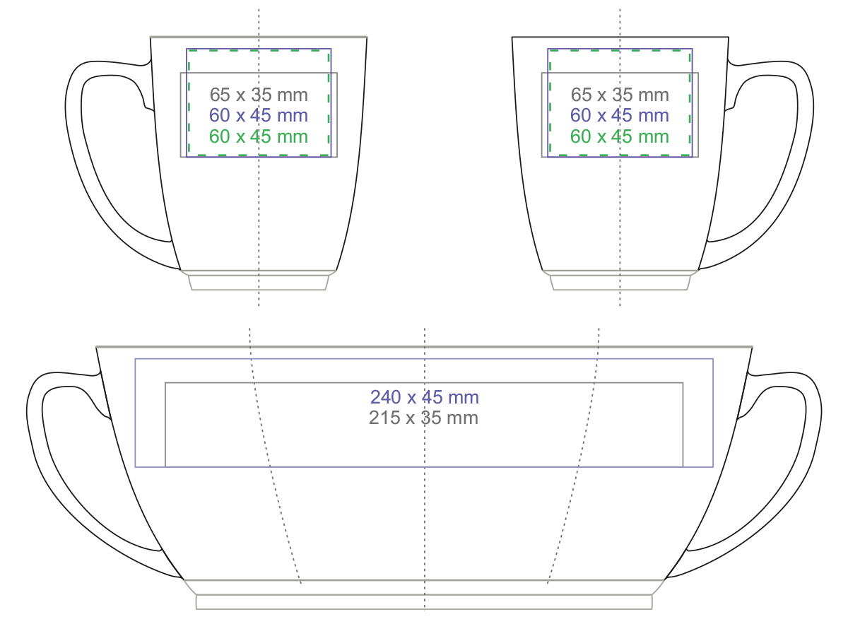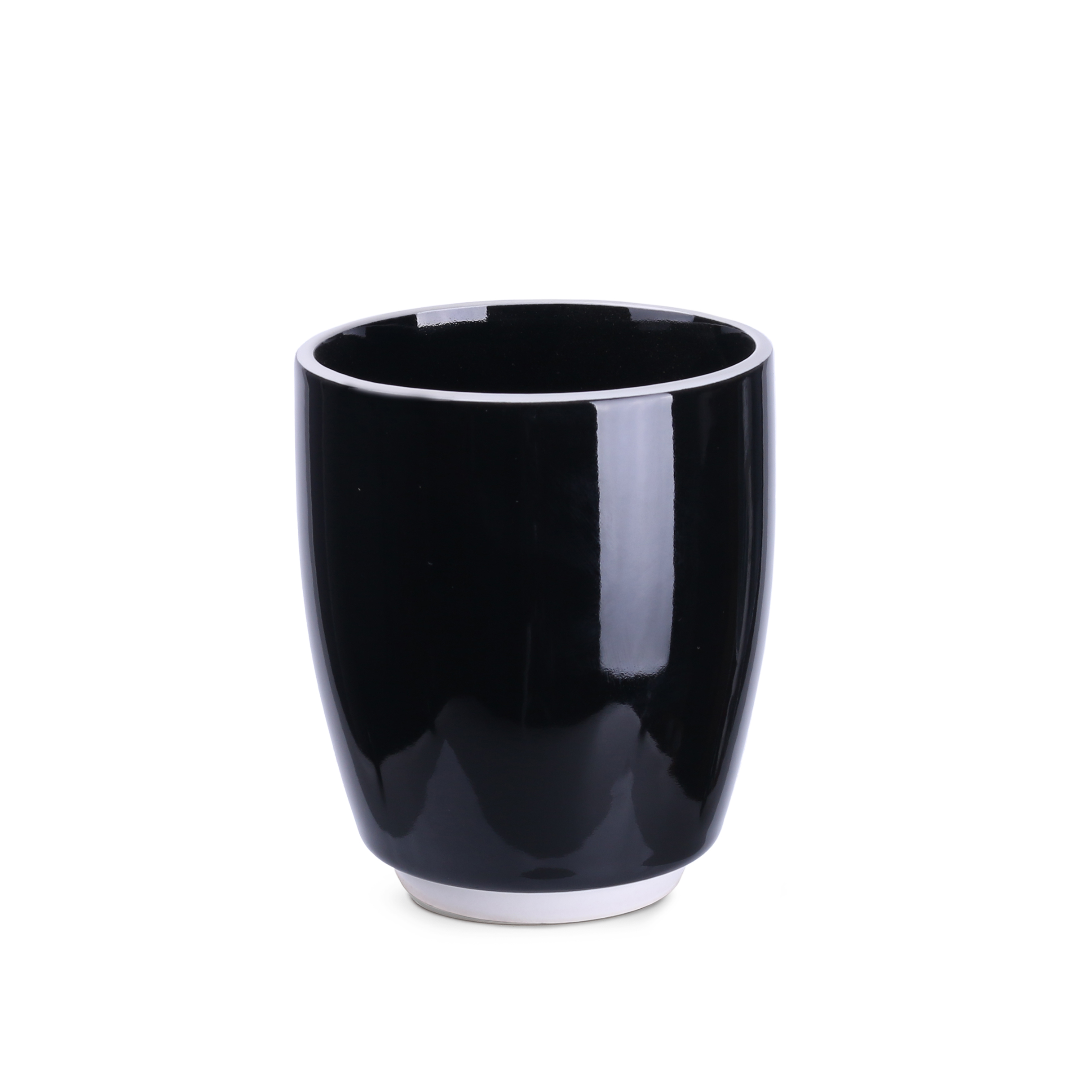 Pojemny, czarny kubek reklamowy o obłym kształcie z charakterystycznymi białymi wstawkami na rancie oraz w dolnej części. Duży uchwyt zapewnia wygodne trzymanie.