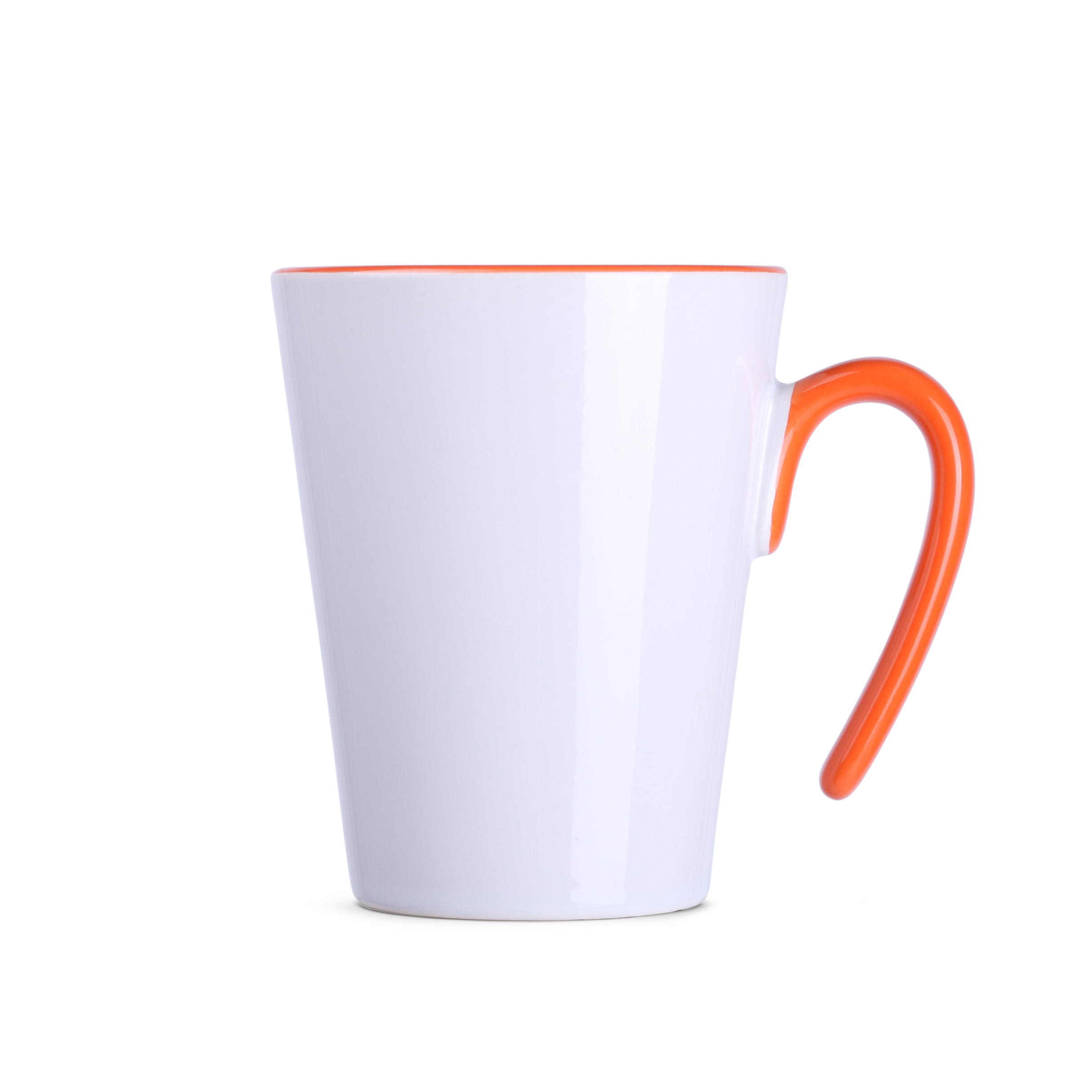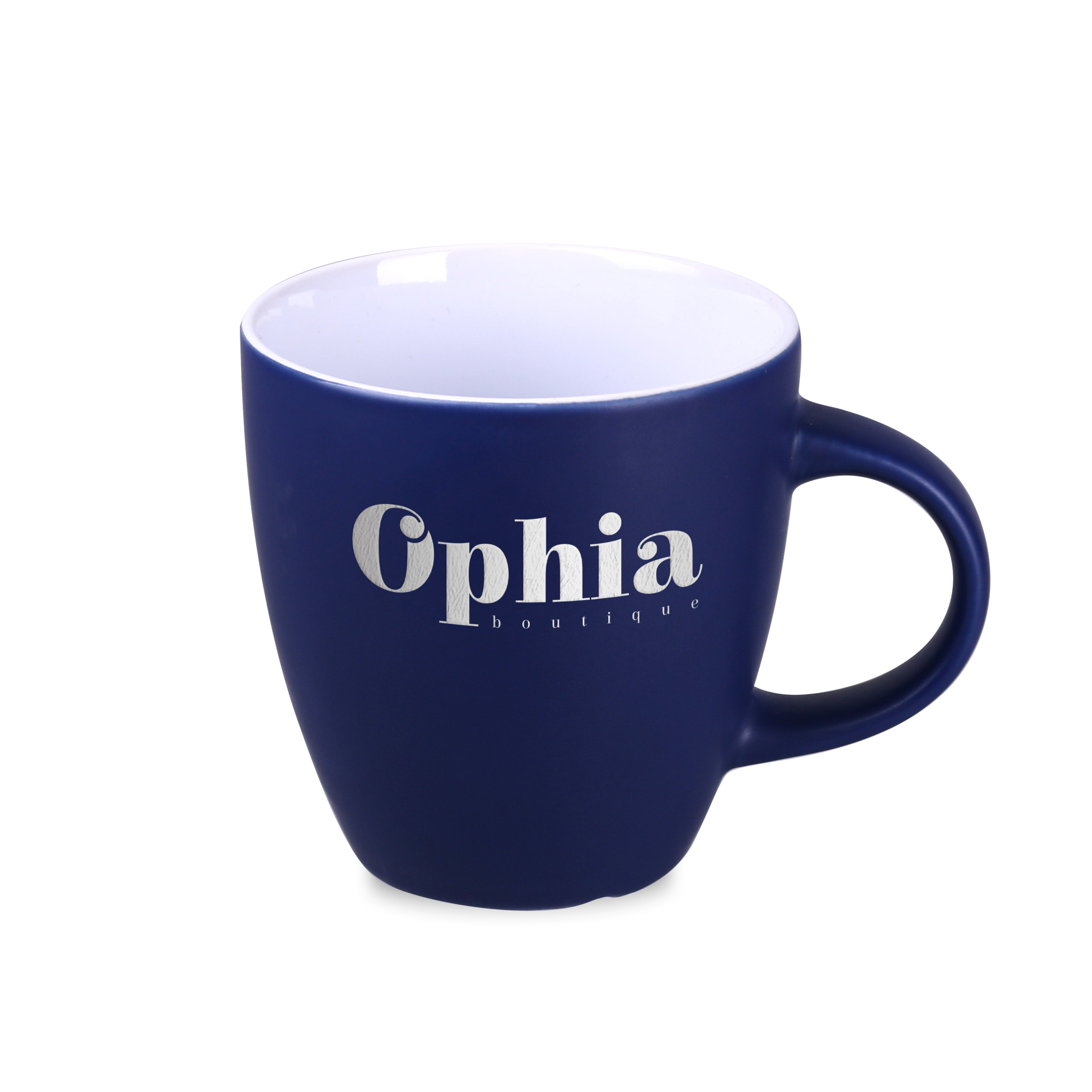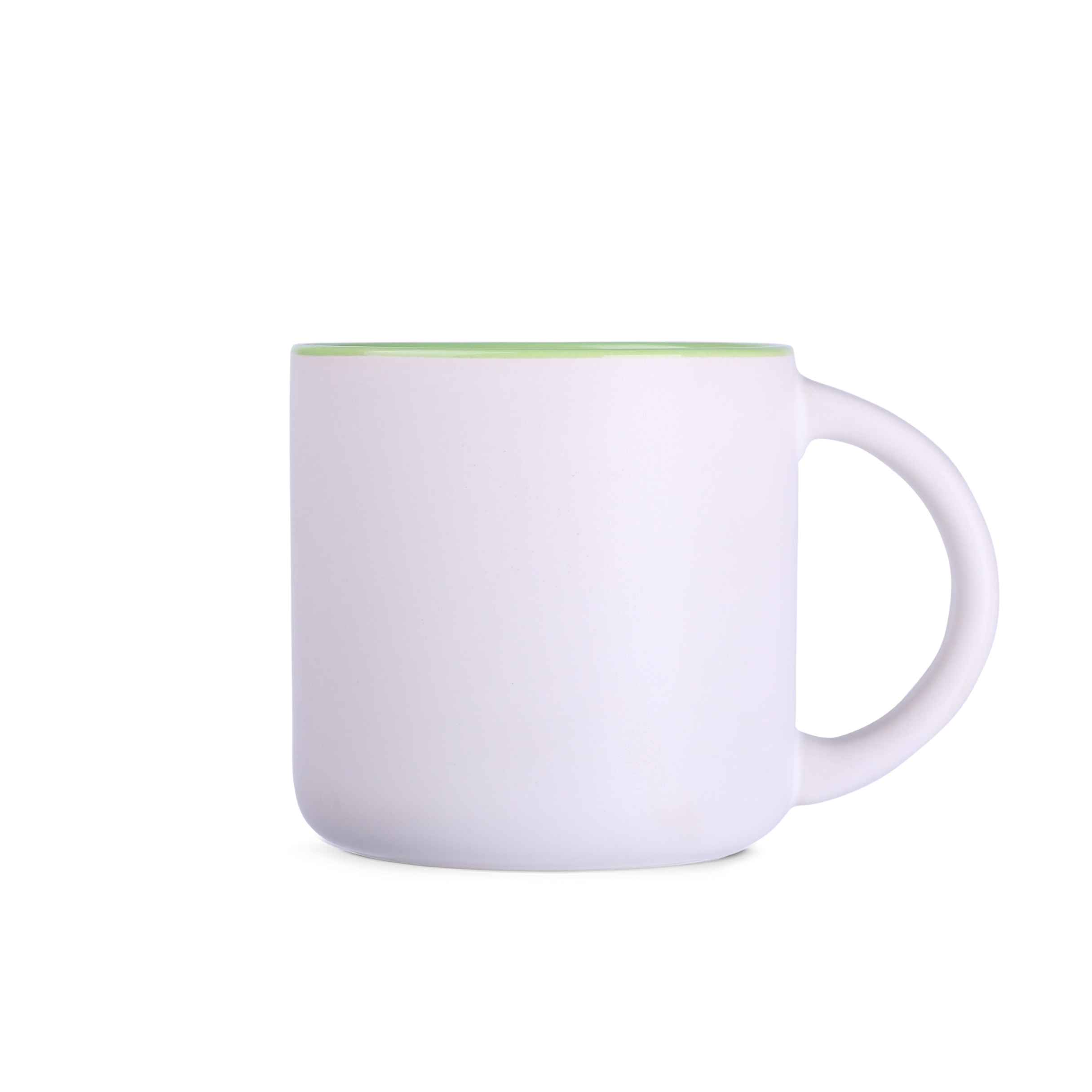 Mały z wyglądu, lecz o dużej pojemności kubek ceramiczny o czarnej, matowej powierzchni zewnątrz i kolorowym środku.
