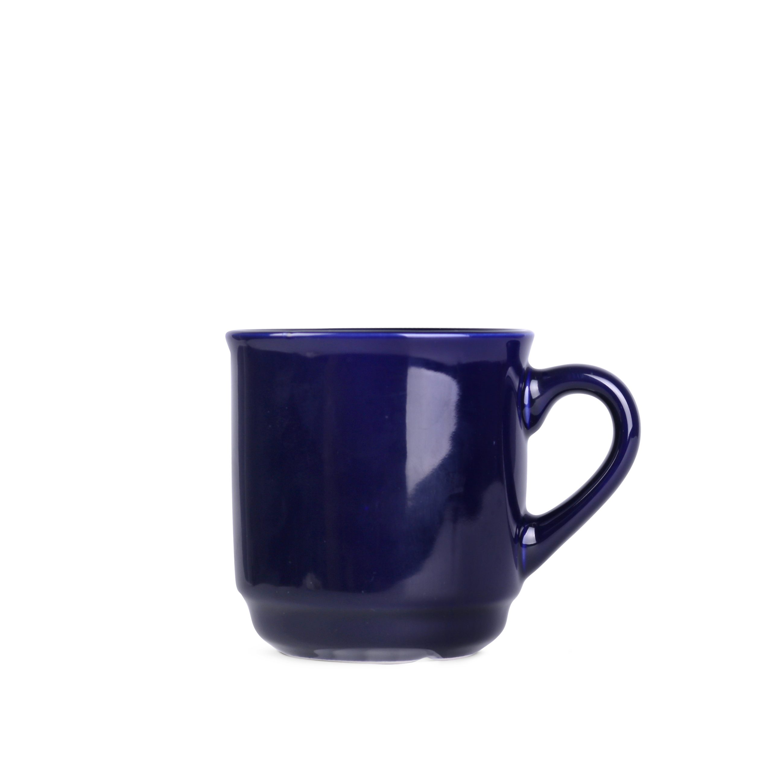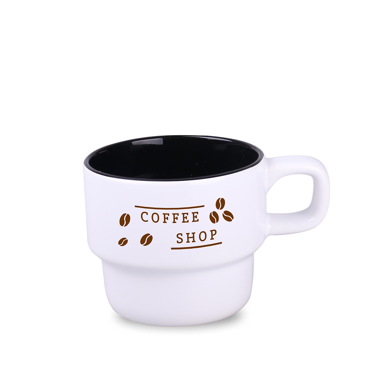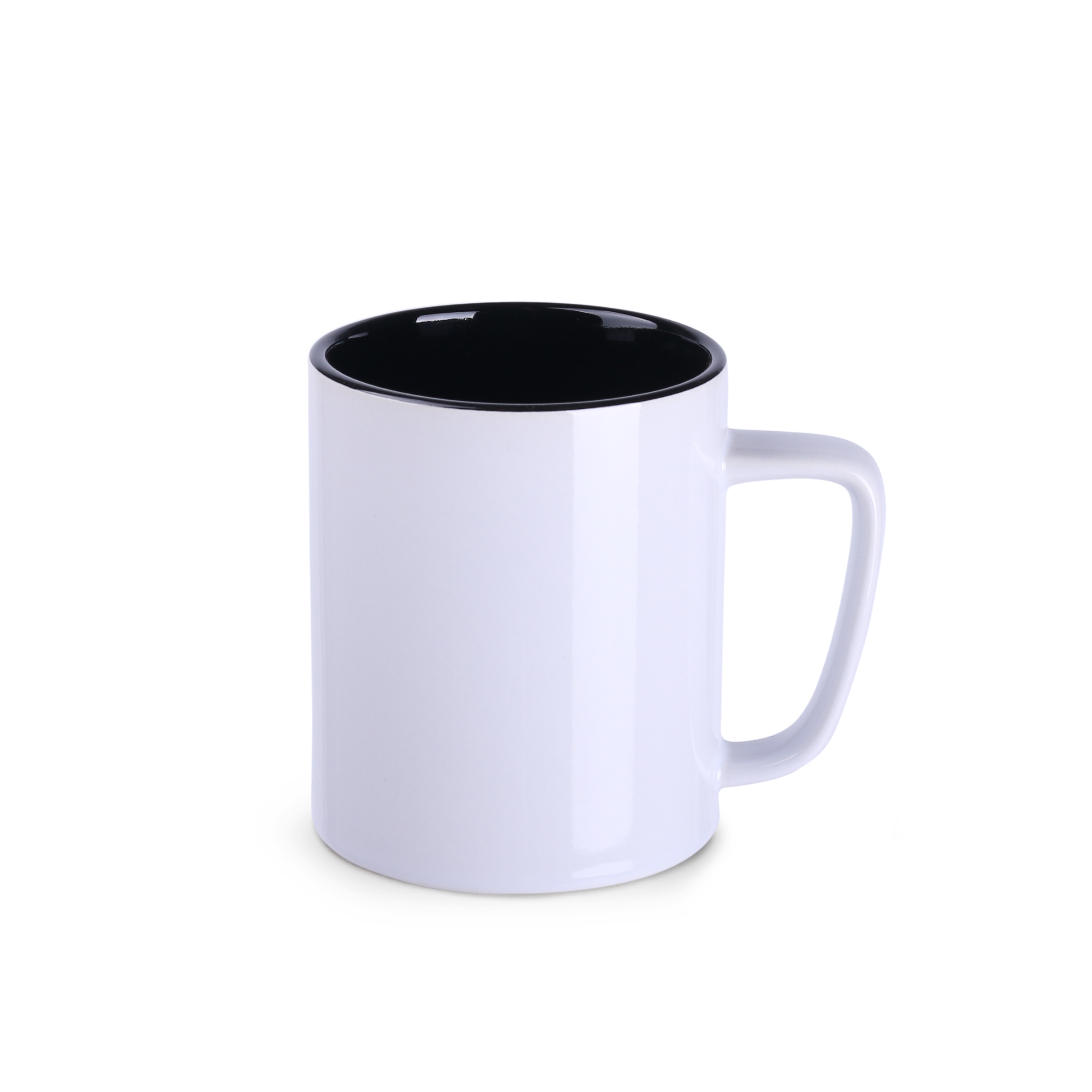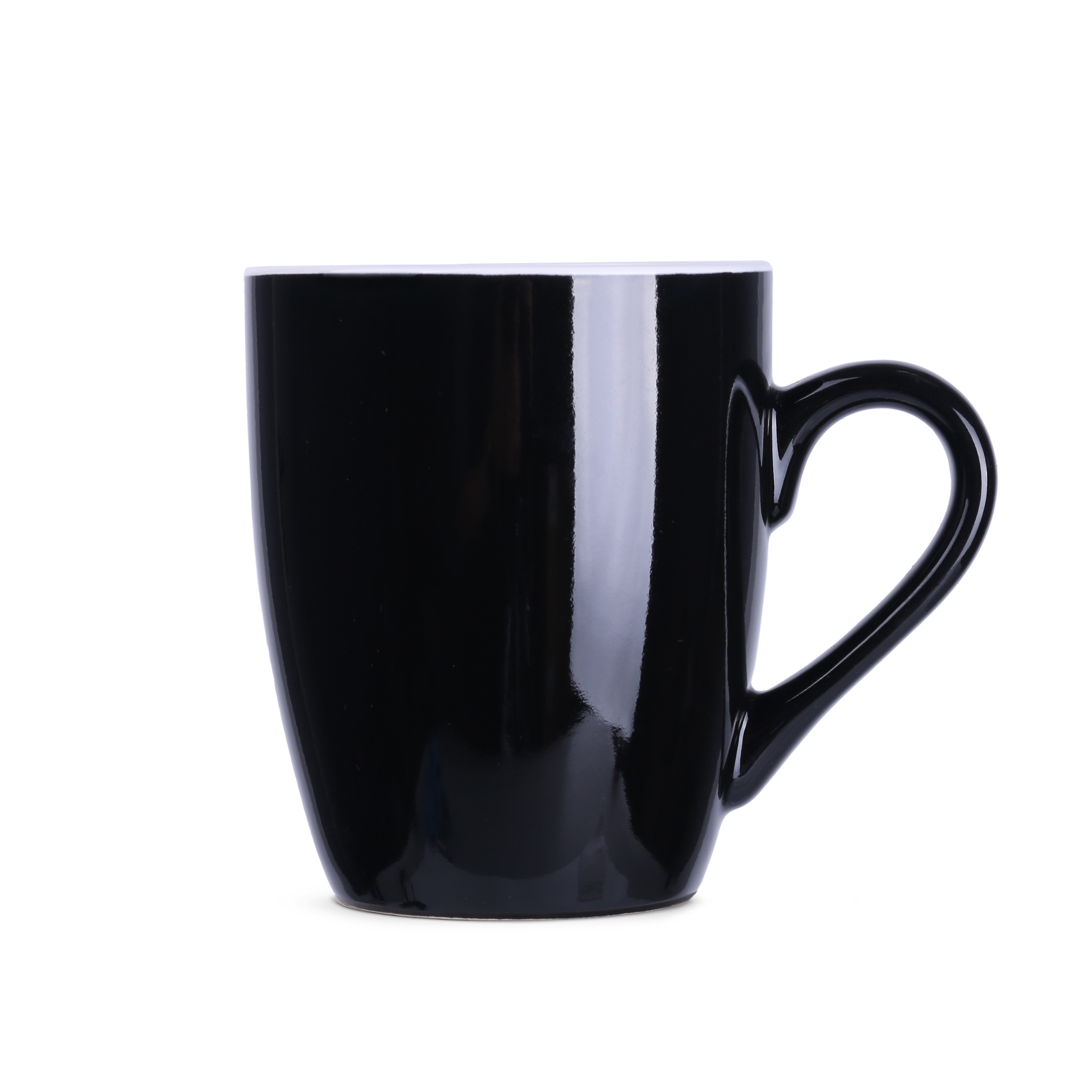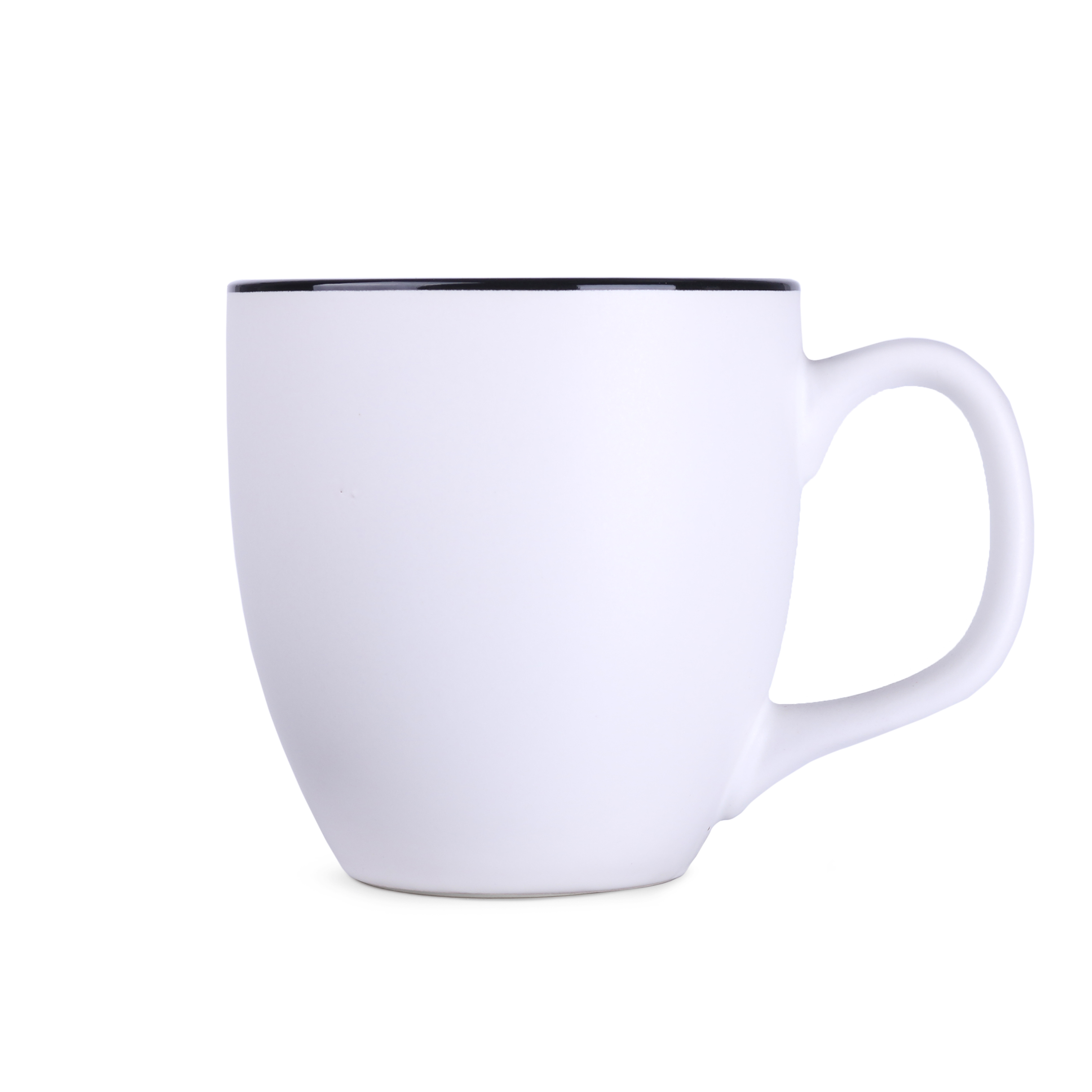 Mały z wyglądu, lecz o dużej pojemności kubek ceramiczny o czarnej, matowej powierzchni zewnątrz i kolorowym środku.