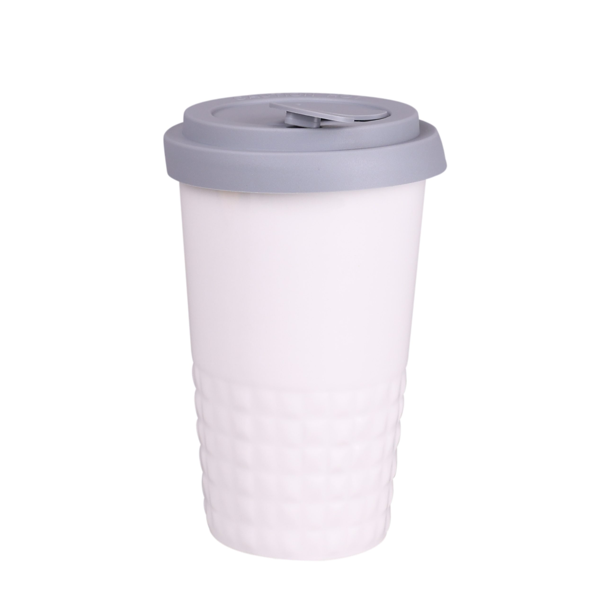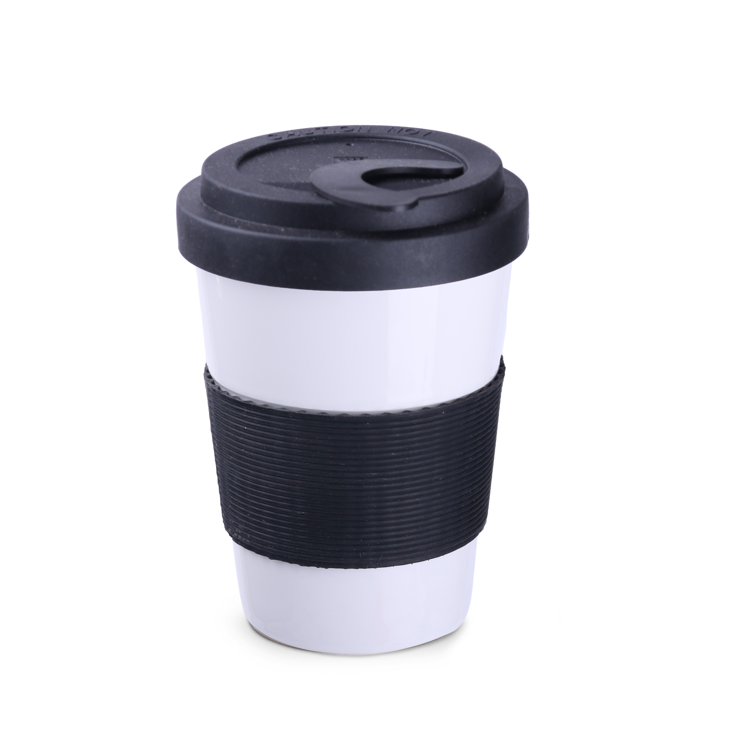 Porcelanowy kubek z silikonową opaską oraz przykrywką, które ułatwiają korzystanie z kubka w każdych warunkach. Silikonowe dodatki dostępne w czterech wersjach kolorystycznych: pomarańczowej, czerwonej, niebieskiej oraz czarnej.