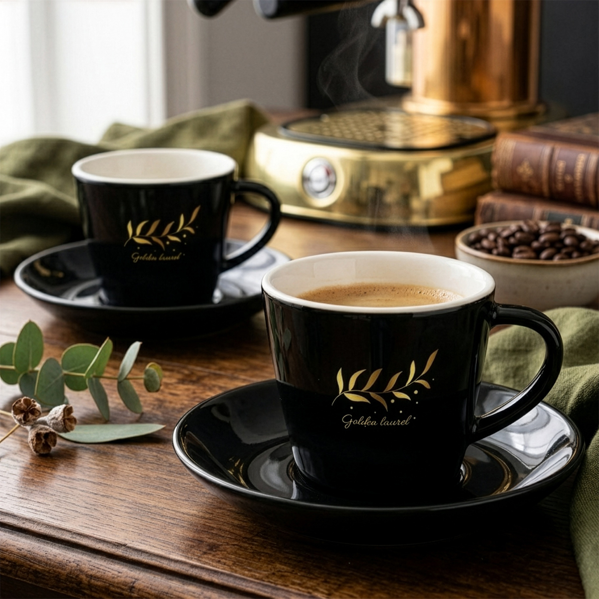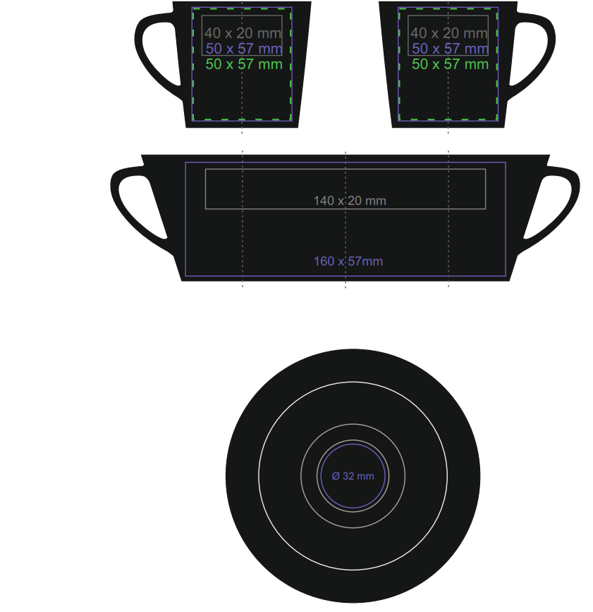 Filiżanka w czarnym kolorze, o prostym, klasycznym kształcie. Wykonana z porcelany. Posiada ergonomiczne ucho i duże pole w zakresie nanoszenia zdobień. Występuje w dwóch pojemnościach.